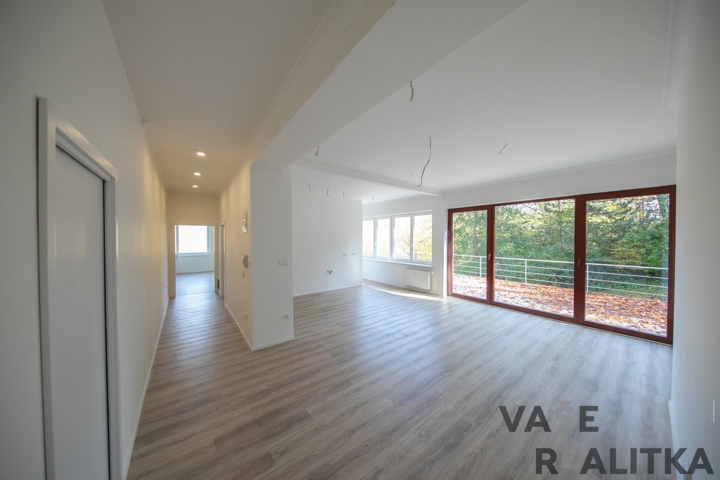 Byt 3+kk s velkou rozlohu 84.7 m2 jehož obrovskou předností je hlavně soukromá terasa k bytu o výměře 99 m2, která je přístupná přímo z prostoru obývacího pokoje propojeného s kuchyňským koutem. Byt se nachází v 1.NP, náleží k němu také 2 parkovací místa v uzavřeném areálu residence, podíl na krásné zahradě kolem domu, která má výměru větší než 6600 m2 a sklepní prostor. Byt je výborně dispozičně řešený s neprůchozími pokoji. Velký obývací prostor moderně propojený s kuchyňským koutem, připraveným na instalaci kuchyňské linky, dva pokoje, velká vstupní chodba a koupelna kde se nachází dvě umyvadla, sprchový kout, vana, WC a přípojka na pračku a sušičku. Z bytu je nádherný výhled do celého lázeňského okolí.