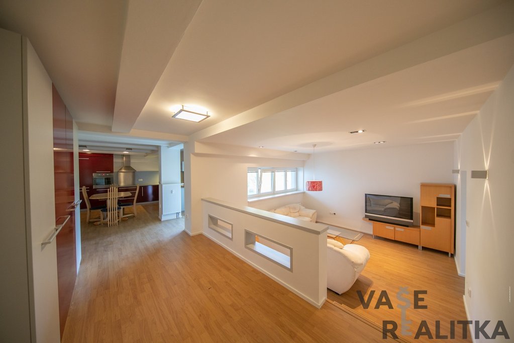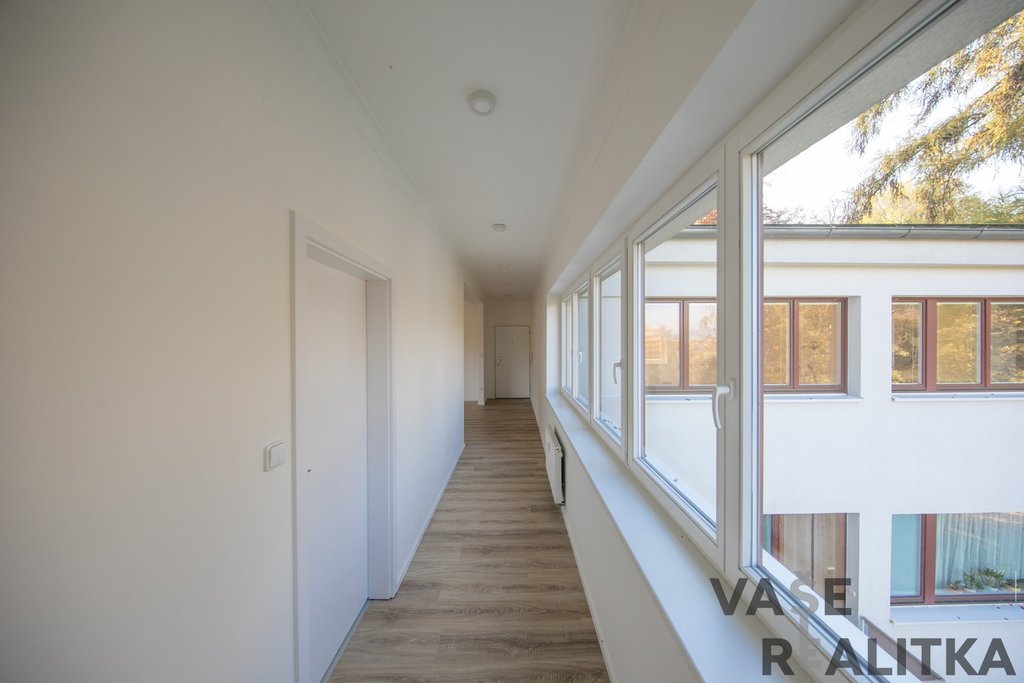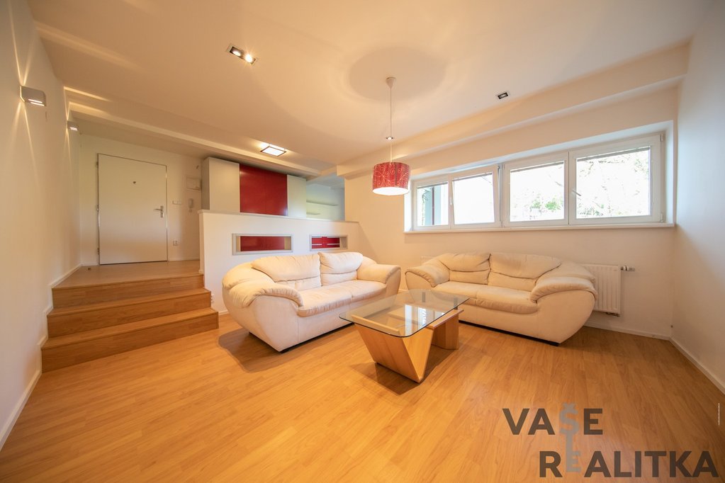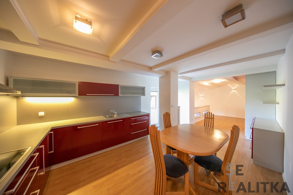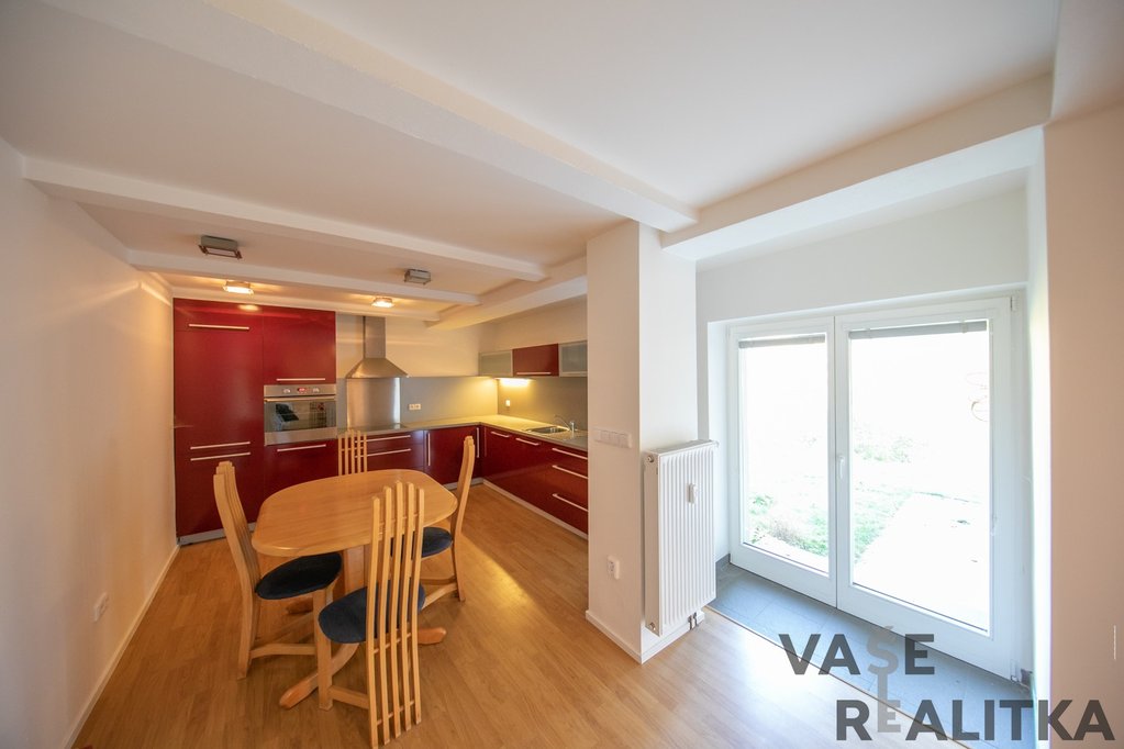 Byt 2+kk s velkou rozlohu 79.6 m2 jehož obrovskou předností je hlavně soukromá zastřešená terasa k bytu o výměře 41.5 m2, která je přístupná přímo z kuchyně a nabízí také přímý vstup dále na zahradu. Byt se nachází v 1.PP, náleží k němu také 2 parkovací místa v uzavřeném areálu residence, podíl na krásné zahradě kolem domu, která má výměru větší než 6600 m2 a sklepní prostor. Byt je výborně dispozičně řešený se zajímavým mimoúrovňovým řešením přechodu z kuchyně do propojeného obývacího prostoru. Kuchyně, která je zde instalovaná vč. spotřebičů je propojená přes velkou jídelnu a vstupní chodbu s obývacím prostorem ze, kterého je vstup do ložnice a dále koupelny, kde se nachází umyvadlo, sprchový kout a WC.