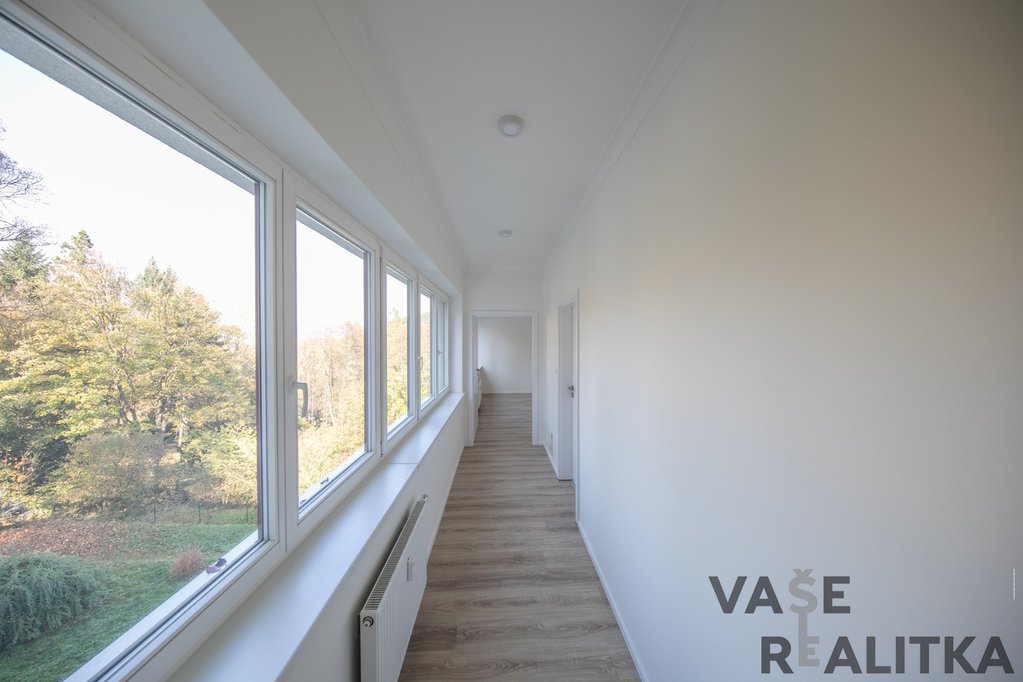 Byt 4+kk má nadstandardní rozlohu 102.5 m2 a disponuje dvěma koupelnami. Byt se nachází v posledním 3.NP, náleží k němu také 2 parkovací místa v uzavřeném areálu residence, podíl na krásné zahradě kolem domu, která má výměru větší než 6600 m2 a sklepní prostor. Byt je výborně dispozičně řešený s neprůchozími pokoji a jedná se o rozlohu, která zabírá celé patro. Velký obývací prostor moderně propojený s kuchyňským koutem, připraveným na instalaci kuchyňské linky, tři pokoje a dvě koupelny, kde ve větší z nich se nachází dvě umyvadla, sprchový kout, vana, WC a přípojka na pračku a sušičku a v menší se nachází umyvadlo, sprchový kout a WC. Jeden z pokojů je oddělen od dalších prostor, kdy společně s menší koupelnou tvoří prakticky oddělený prostor pro dostatek soukromí. Z bytu je nádherný výhled do celého lázeňského okolí.